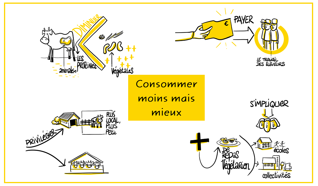 Les participants ont d'abord évoqué le fait de modifier leur comportement de consommation en consommant moins mais mieux. Pour rendre cela envisageable, plusieurs idées ont été proposées, comme le fait de remplacer la protéine animale par d'autres protéines tels que les lentilles, les haricots, les fruits secs, etc., ou encore de privilégier l'achat de produits possédant un label de qualité et issus de petits élevages, d'accepter de mettre le prix pour des produits de meilleure qualité et éthiquement plus acceptables. Le développement de repas végétariens dans les collectivités et dans les restaurants permettrait également de tendre vers cet objectif. Cela nécessite de s'impliquer dans la vie politique de la commune ou encore dans les associations de parents d'élèves. Enfin, la notion de durabilité des filières a été évoquée : en élevage de volaille par exemple, pourquoi ne pas avoir une seule filière qui produise à la fois des oeufs et de la viande ? Idem en élevage bovin : pourquoi ne pas avoir des bovins qui produisent à la fois du lait et de la viande ? Cela permettrait de répondre à certaines problématiques rencontrées dans les filières telles que le devenir des poussins mâles en filière poules pondeuses ou encore le devenir des petits veaux mâles en filière lait.