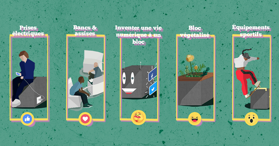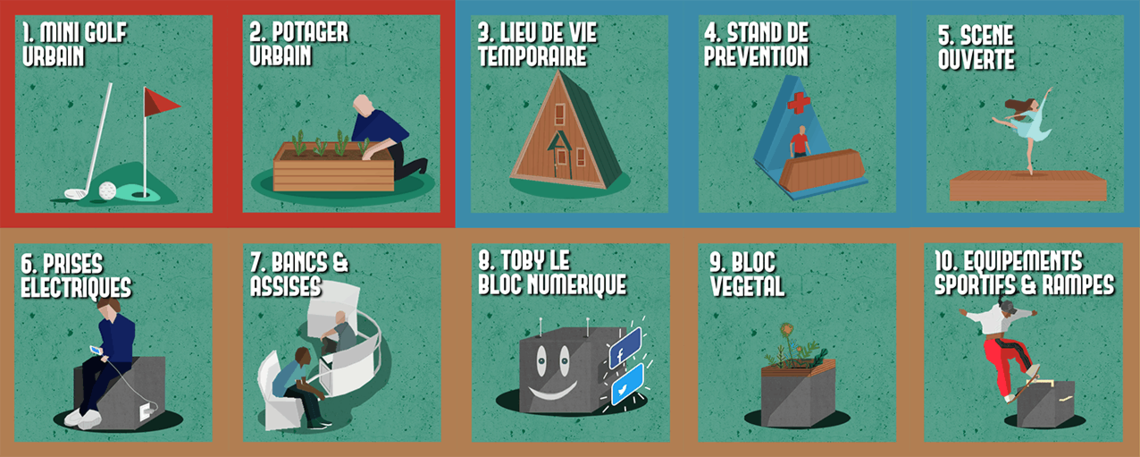 - Des blocs bétons électrique, des bancs et assises, Un bloc auquel on invente une vie numérique nommé Toby, un bloc végétalisé, ainsi que des équipements sportifs et des rampes sur les blocs de la presqu’ile.
