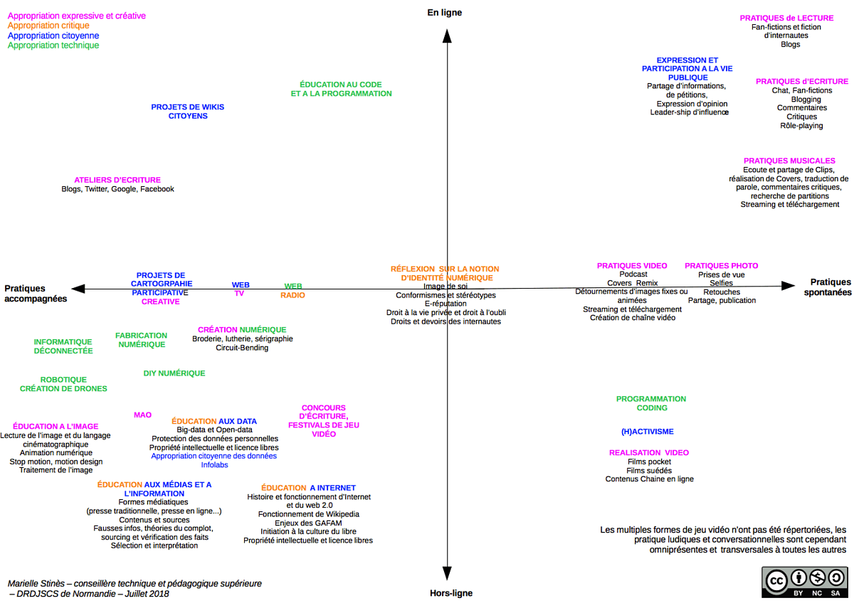 Le schéma suivant vise à mettre à plat et mieux visualiser les différents aspects de l’appropriation de la culture numérique par les jeunes et à souligner à la fois le foisonnement des pratiques spontanées et les formes très variées que peut prendre leur accompagnement en fonction de ces modalités d’appropriation.