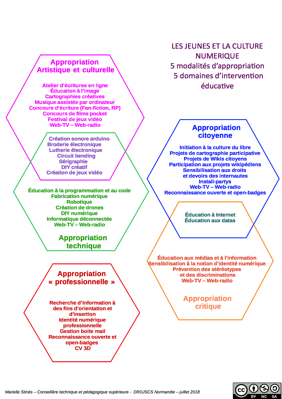 On peut distinguer l’appropriation citoyenne qui consiste à prendre une part active aux mondes numériques, à expérimenter des formes de participation via le web 2.0, de l’appropriation critique qui consiste à prendre du recul sur les pratiques et les problématiques spécifiques du numérique, leurs tenants et leurs aboutissants, dans une dimension plus réflexive.