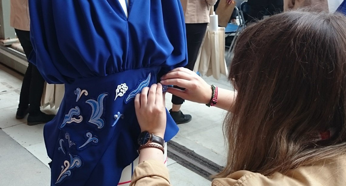 Avec ces mêmes machines, les élèves du lycée professionnel Flora Tristan de La Ferté-Macé (Orne, 61), ont créé des boutons fonctionnels imaginés pour l'occasion, une broderie d'encre en relief sur un le dos d'une veste pour homme et un flocage de motif corallien sublime contrastant sur le bleu de la robe. Ils se sont rendus au Fablab à proximité de leur établissement, Les Bains Douches Numériques de Flers.