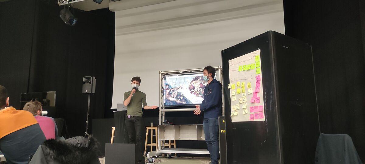 Notre sujet colle avec les deux thèmes attribués dans la matinée. La nourriture est la base de la religion pastafariste, les adeptes sont accompagnés durant toute leur vie et le culte fait grandir leur esprit critique. Le Pass'Tafarisme leur propose alors des réductions sur leurs achats liés aux pâtes et a pour objectif de les fédérer autour d'une application et d'un forum officiel. L'épreuve du feu fut le pitch finissant le premier jour, une minute seulement, afin de vendre le projet.