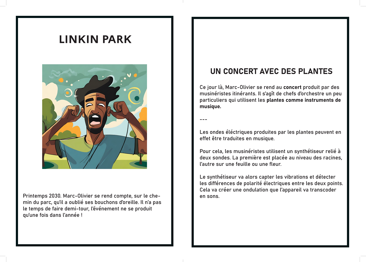 Le lundi matin, les étudiant·e·s plongent dans le bain avec l'intervention d'une experte, Nathalie Montigné du Pavillon, avant d'explorer les futurs possibles grâce à un exercice de design fiction, les black stories : on expose une situation à éclaircir et la cause de la situation (une technologie existante déployée dans un futur proche ou lointain comme des plantes qui chantent, des villes flottantes, des abeilles drones ou encore des tours végétalisées).