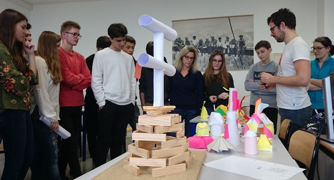 Les enseignantes du projet, Hélène Deveaux et Charlotte Robillard (Enseignement transversal STI2D), accompagnent les élèves dans un processus créatif de maquettage avec des contraintes géométriques simples.