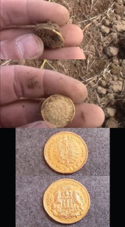 Il existe plusieurs pièces de 10 marks en or frappées en 1875. Certaines sont bien entendu à l’effigie du Kaizer Guillaume 1er mais la plupart sont propres à chaque «état» de l ’ Empire Allemand. La monnaie, trouvée par un prospecteur avec un détecteur de métaux, porte la légende «Freie und Hansestadt Hambourg» (« Ville libre de la Hanse ») qui renvoie à son histoire médiévale.