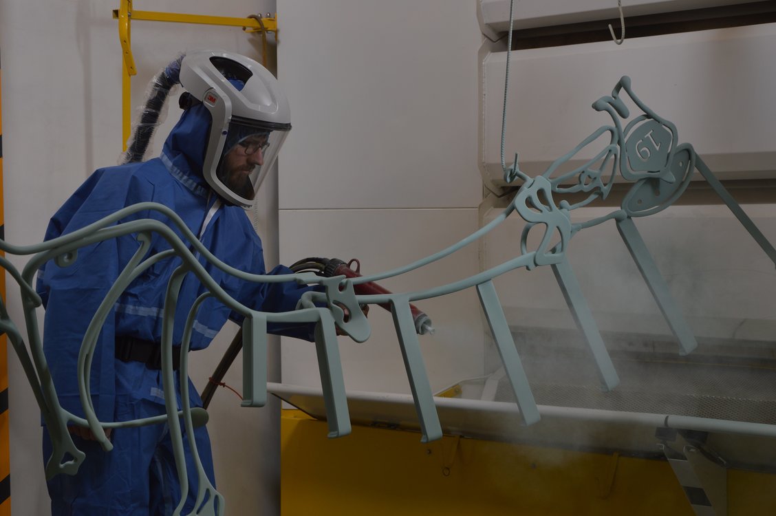« C’est une peinture en poudre précuite que l'on l’applique avec un pistolet électrostatique avec un jeu de masse qui va attirer la peinture sur la pièce métallique. On peut accéder à des endroits où une peinture classique ne pourrait pas aller, on a de la peinture aussi bien à l’intérieur qu’à l’extérieur. Tous les solvants classiques sont absents, c’est écologique, on a moins de déchets et ils sont plus facilement collectables ! Une fois l’objet poudré on le place dans le four de 12 M3, avec la chaleur elle gélifie ».