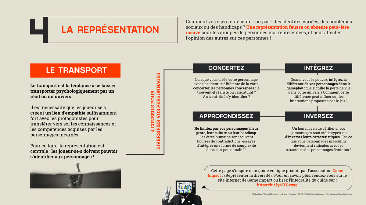 Pour ce faire, la représentation est centrale : les joueur·se·s doivent pouvoir s’identifier aux personnages.