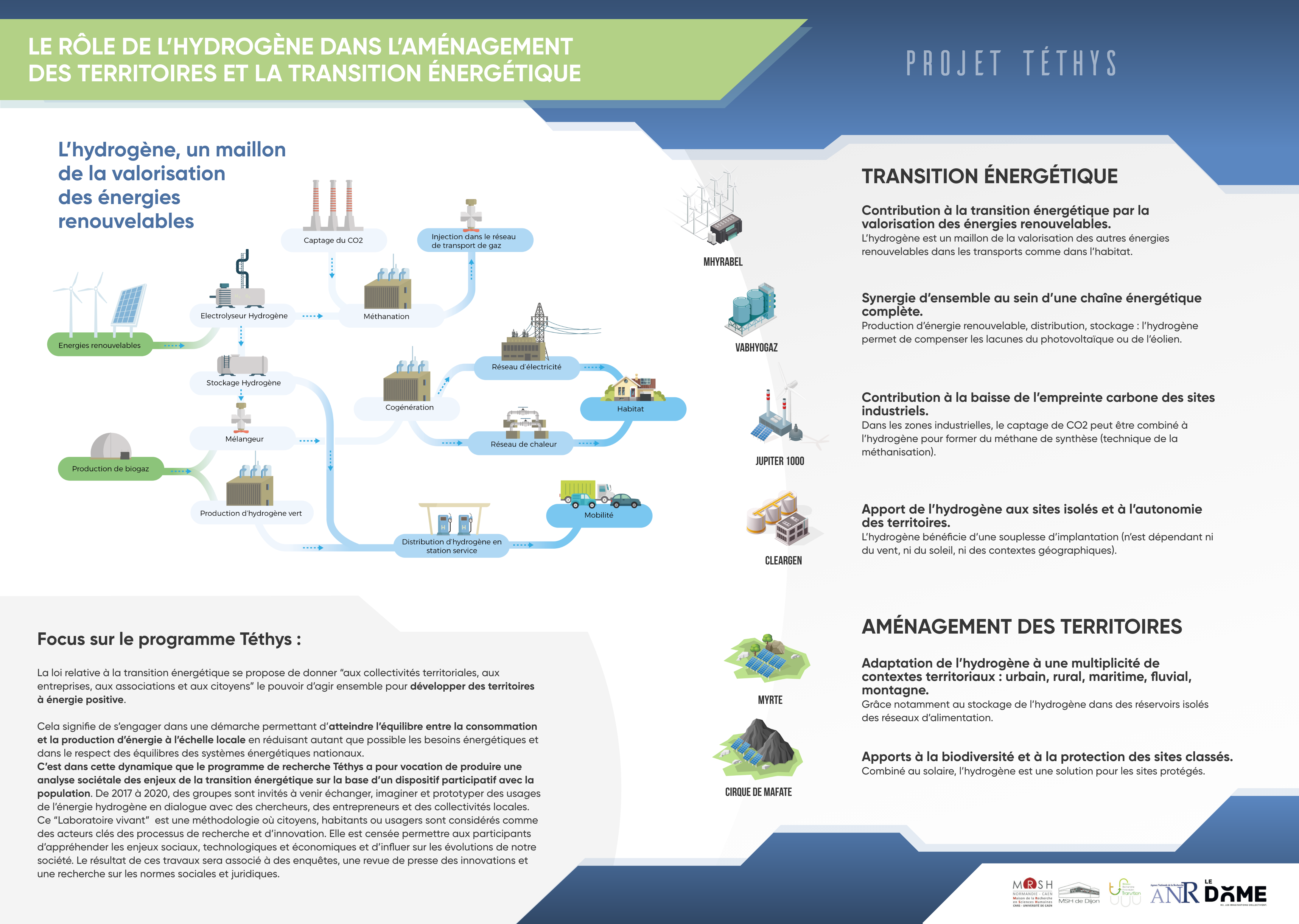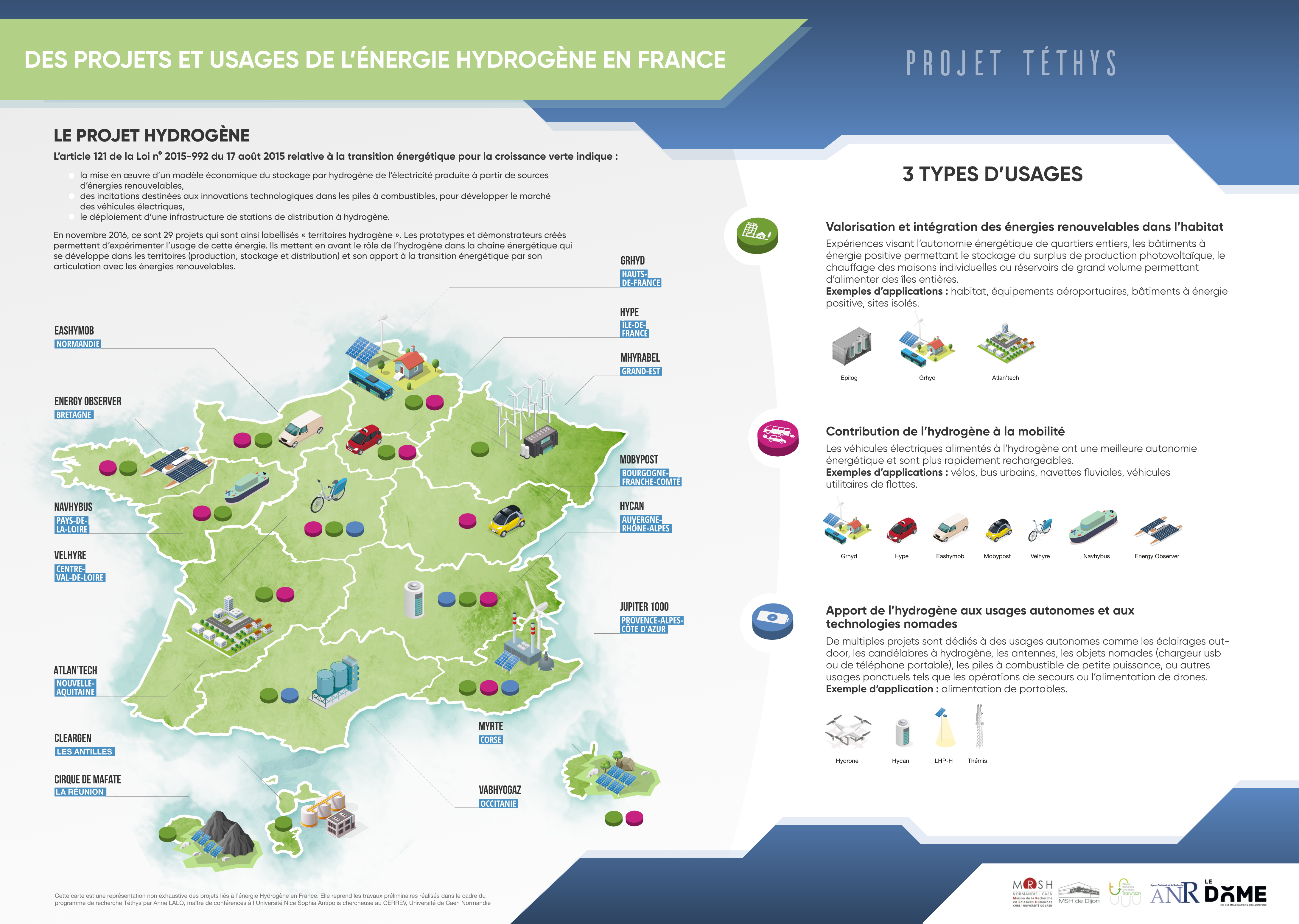L'un des enjeux de la transition énergétique consiste à s'émanciper des énergies fossiles. L'hydrogène peut alors apparaître alors comme une solution. Le programme TÉTHYS questionne la mise en démocratie de la transition énergétique via l’objet hydrogène. Dans ce cadre, il propose ici une définition de ce qu’est l’hydrogène. Une infographie en deux pages accompagne cet article pour visualiser les utilisations de l'hydrogène en France.