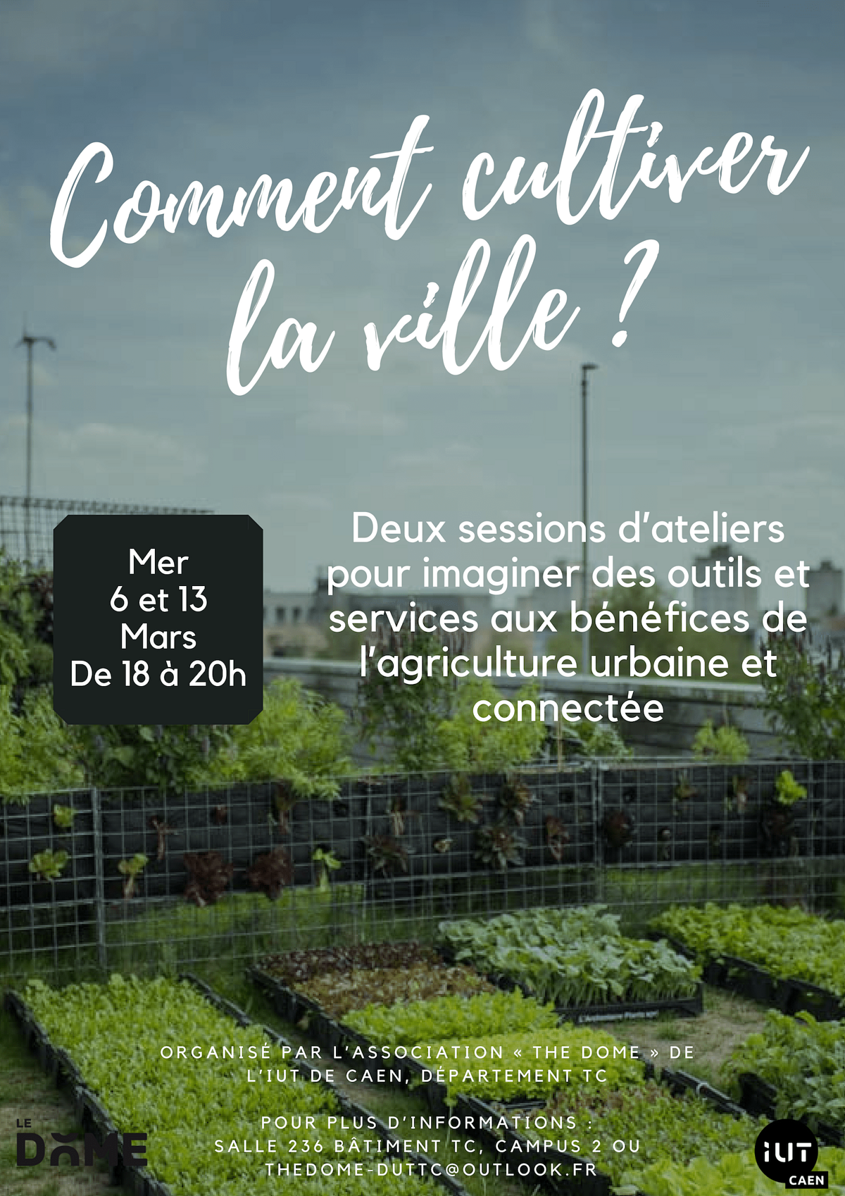 Depuis le début de l’année, 5 étudiants de deuxième année de DUT Techniques de Commercialisation de l’Université de Caen ont organisé une démarche de recherche-action sur le thème de l’innovation dans l’agriculture urbaine. Accompagné par le Dôme dans leur projet, 2 sessions d’ateliers participatifs viendront clore ce travail les 6 et 13 mars prochain.