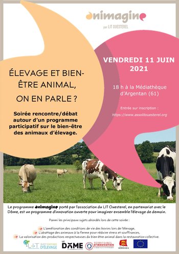 Afin de lancer son programme de réflexion participatif « ANIMAGINE, le bien-être animal, on en parle ? », l’association du LIT OUESTEREL organise, en partenariat avec le Dôme, une soirée rencontre/débat sur le thème du bien-être des animaux d’élevage, le vendredi 11 juin 2021 à la médiathèque d’Argentan.