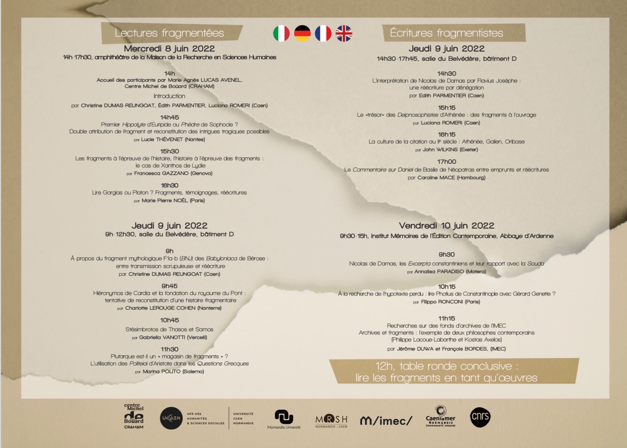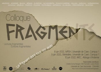Ce colloque international sur les fragments grecs est consacré aux ressources littéraires qui n’ont pas subsisté intégralement. Bien que nombreuses, ces œuvres fragmentaires sont méconnues du public non spécialiste. Elles seront envisagées dans des perspectives croisées (auteurs fragmentés, compilateurs de fragments et pratiques d’écriture fragmentaire). L’intérêt sera de renouveler la perception et la valorisation d’un potentiel méconnu et insuffisamment exploité dans le champ de la recherche européenne en sciences de l’Antiquité.