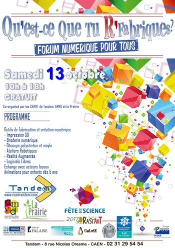 Démonstration et découverte des outils fablab (impression 3D, découpe laser, broderie numérique, découpeuse polystyrène et vinyle,transfert sur tissus). rencontre des différents acteurs locaux autour du numérique. Informations sur le recyclage et le développement durable. Atelier de robotique et information sur les Logiciels Libres. Démonstration casque réalité virtuelle.