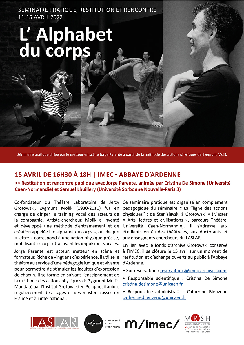 Collaborateur du Théâtre Laboratoire fondé par Jerzy Grotowski, Zygmunt Molik (1930-2010) fut en charge de diriger le training vocal des acteurs de la compagnie. Artiste-chercheur, Molik a inventé et développé une méthode d’entraînement et de création appelée l’ « alphabet du corps », où chaque « lettre » correspond à une action physique précise, mobilisant le corps et activant les impulsions vocales. Ce séminaire pratique est organisé en complément pédagogique du séminaire « La ‘‘ligne des actions physiques’’ : de Stanislavski à Grotowski » (Master « Arts, lettres et civilisations », parcours Théâtre, Université Caen-Normandie).