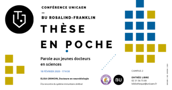 Le cycle de conférences "Thèse en poche" propose aux docteurs de présenter leurs travaux de recherche puis d’échanger et répondre aux questions du public, avec l’aide d’un modérateur. Prochaine séance avec Elisa Grimoin, docteure en neurobiologie (Imagerie & stratégies thérapeutiques des pathologies cérébrales et tumorales · ISTCT | UMR 6030 UNICAEN-CNRS-CEA)