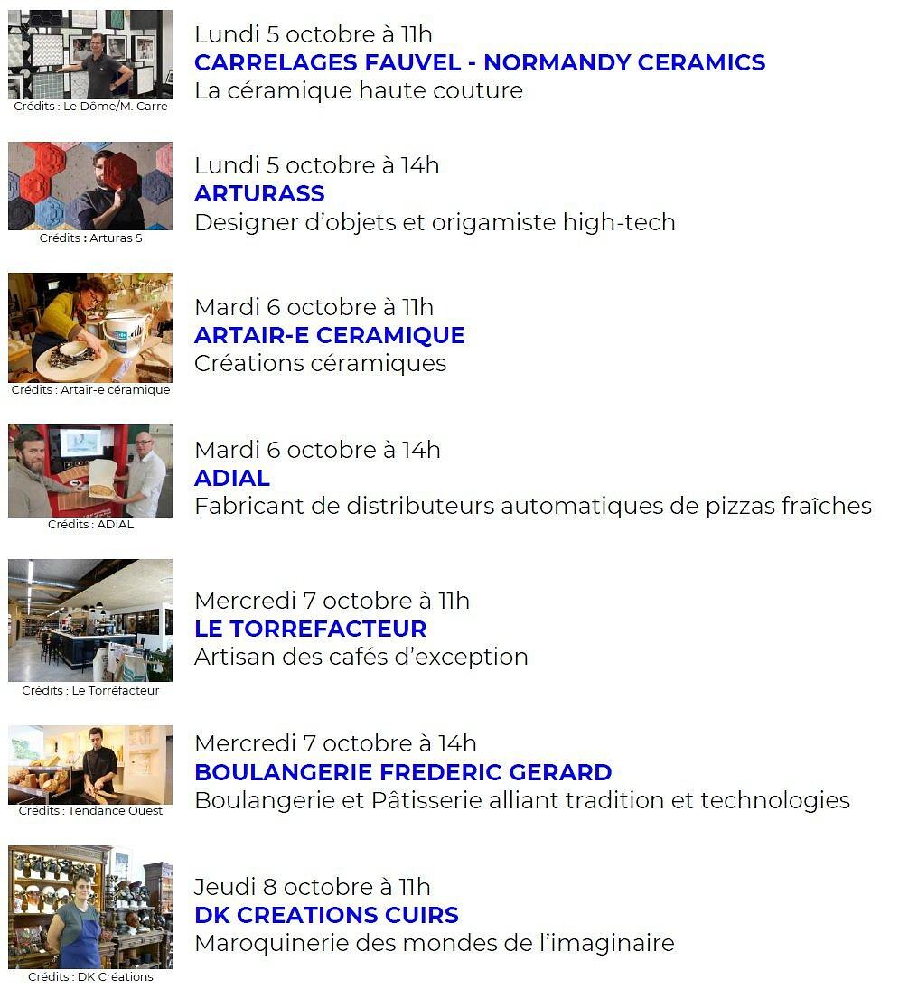 Ils vous proposeront des échanges interactifs autour de leur entreprise, de leurs outils et de leur quotidien d’entrepreneur : Adial (Lisieux, 14), ArtAir-e Céramique (Verson, 14), Arturas S (Rouen, 76), Carrelages Fauvel-Normandy Ceramics (Moon-sur-Elle, 50), DK Créations Cuirs (St-Pierre-sur-Dives, 14), Frédéric GERARD (Caen, 14), Le Torréfacteur (Epron, 14).