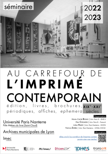 L’Imec est partenaire du séminaire « Au carrefour de l’imprimé contemporain (éditions, livres, brochures, périodiques, affiches, ephemera XIX-XXIe siècle). Cette séance en visioconférence sera consacrée à la question de "l'exposition du livre". Avec les interventions de: