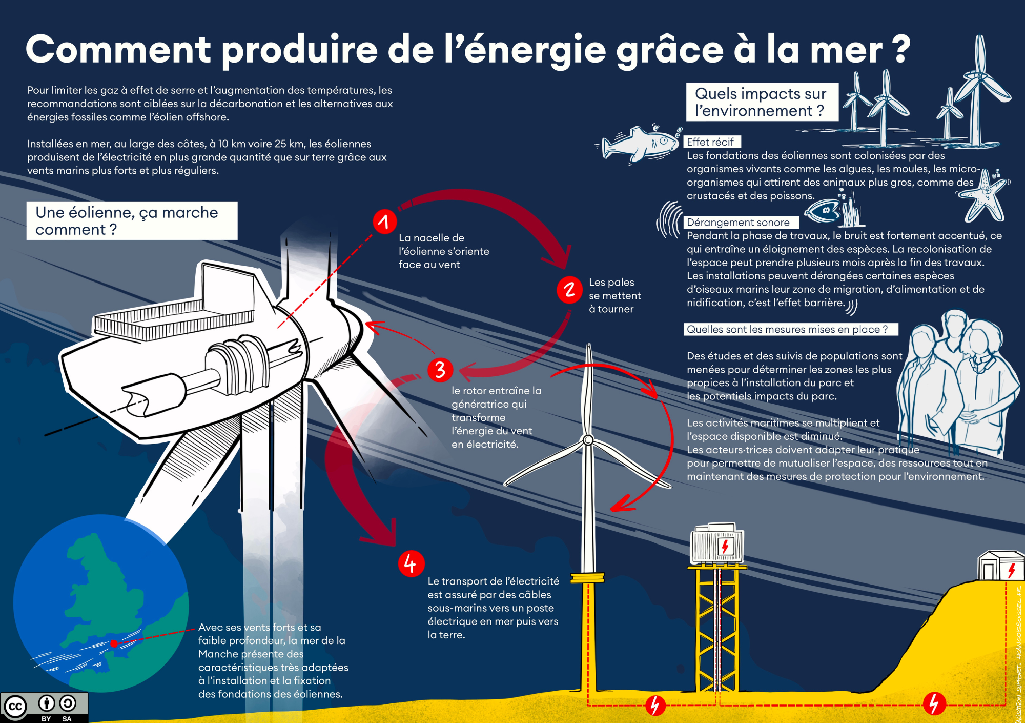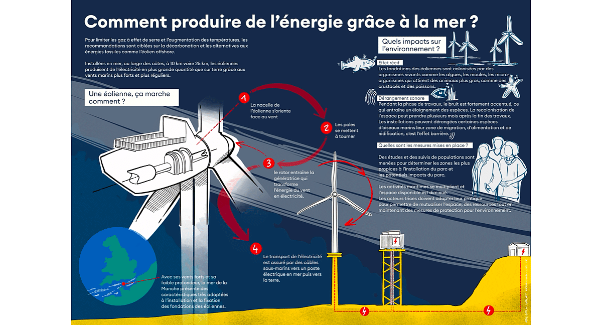 Ciblées pour limiter les gaz à effet de serre et l’augmentation des températures, les éoliennes offshore se déploient sur l’espace maritime. Comment fonctionnent-elles ? Comment le développement des énergies marines renouvelables est-il perçu par les autres acteurs·trices du territoire ?